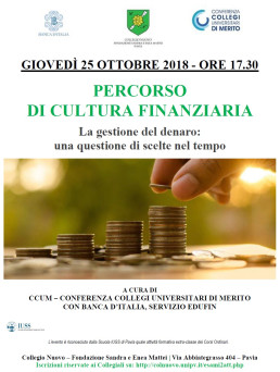 L’incontro, che si terrà presso il Collegio Nuovo, membro della CCUM, sarà tenuto dal dott. Pietro Turrisi, Referente per l’Educazione Finanziaria Lombardia di Banca d’Italia e da altri qualificati professionisti del Servizio EduFin di Banca d’Italia. L’incontro è aperto a tutti gli studenti dei Collegi di merito quale attività di formazione non formale ed è riconosciuto dalla Scuola Universitaria Superiore IUSS quale attività extra per gli Ambiti disciplinari di Scienze Umane, Scienze e Tecnologie e Scienze Biomediche