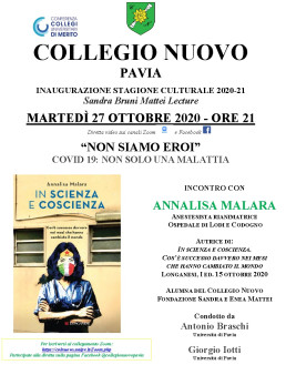 27 ottobre 2020: “Riacciuffare l’anima del paziente”. Come e perché ho scelto di lavorare in Rianimazione e come ci si prepara per la Specialità. Incontro con Annalisa Malara, Alumna, Anestesista e Rianimatrice – Ospedale di Lodi e Codogno; autrice di: In scienza e coscienza. Cos’è successo davvero nei mesi che hanno cambiato il mondo (Longanesi, 2020); Alumna del Collegio Nuovo – Fondazione Sandra e Enea Mattei