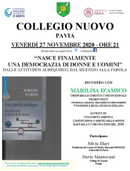 Con Marilisa D’Amico, Prorettrice con Delega a Legalità, Trasparenza e Parità di Diritti dell’Università di Milano dove insegna Diritto Costituzionale, interverranno Silvia Illari, Presidente del MERGED dell’Università di Pavia (dove insegna Istituzioni di diritto pubblico presso il Dipartimento di Scienze Politiche e Sociali diretto da Enrica Chiappero) e Dario Mantovani, Presidente del Centro per la Storia dell’Università di Pavia, nonché Docente di “Droit, culture et société de la Rome antique” al Collège de France di Parigi, oltre che Consigliere del CDA della Fondazione del Collegio Nuovo diretto da Paola Bernardi.