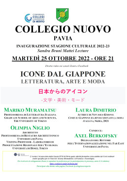 Tornano al Collegio Nuovo per la Sandra Bruni Mattei Lecture intitolata alla Fondatrice del Collegio Nuovo tre ospiti speciali: una docente di Letteratura italiana da Tokyo già visiting student al Nuovo (Mariko Muramatsu) – studiosa, fra gli altri, di D’Annunzio (pubblicò una monografia sulle giapponeserie del Vate) e traduttrice di Anna Maria Ortese e Paola Capriolo; Olimpia Niglio, docente di Restauro architettonico dell’Università di Pavia con profondi legami di studio con il Giappone, ospite della Sezione laureati del Collegio Nuovo; e, per chiudere, una Alumna che si è laureata in Storia dell’Arte e ora è studiosa di moda (Laura Dimitrio). A condurre l’incontro Axel Berkofsky, membro del consiglio direttivo dell’European Japan Advanced Research Network (EJARN) e docente di relazioni internazionali della Cina e del Giappone presso l’Università di Pavia, dove è stato nominato dal Rettore delegato per l’Internazionalizzazione nel Far East.