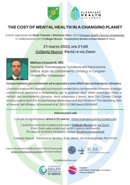 Martedì 21 marzo alle 21 il Collegio Nuovo ospiterà Matteo Innocenti, Psichiatra, Psicoterapeuta, Fondatore dell’Associazione Italiana Ansia da Cambiamento Climatico ed European Climate Pact Ambassador. Autore del libro Ecoansia: I cambiamenti climatici tra attivismo e paura (Erickson, 2022).