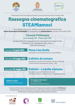In collaborazione con STEAMiamoci, il Comune di Pavia, LabTalento e Terza Missione dell’ Università degli studi di Pavia, in occasione di Pavia Capitale della Cultura di Impresa, anche il Collegio Nuovo propone una rassegna cinematografica: tre occasioni di incontro, accompagnate da testimonianze di giovani role model STE(A)M, tra cui le Alunne Elena Fede e Maria Clara Corda.