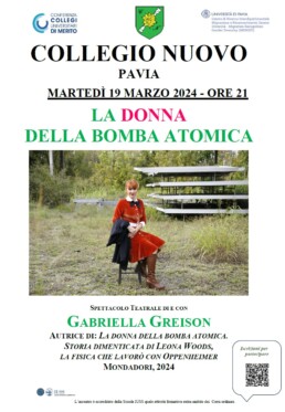 Martedì 19 marzo 2024, alle 21, al Collegio Nuovo – Fondazione Sandra e Enea Mattei di Pavia, va in scena la Fisica, con una storia non più dimenticata grazie alla scrittrice, attrice, divulgatrice scientifica, di formazione fisica nucleare, Gabriella Greison.