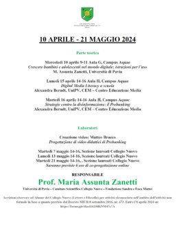 Anche quest’anno si propongono le lezioni e i laboratori di Media education. Teoria e tecniche con la docenza e la supervisione di Maria Assunta Zanetti, docente di Psicologia dello Sviluppo e dell’Educazione presso l’Università di Pavia e membro del Comitato Scientifico del Collegio Nuovo. Con lei Alexandra Berndt del Centro Educazione Media (CEM). I laboratori video sono curati da Riccardo Sannino e Matteo Bracco (CEM)