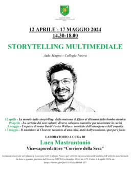 Sono aperte le iscrizioni per il Laboratorio delle competenze trasversali Storytelling multimediale, tenuto dal giornalista Luca Mastrantonio (vice caporedattore del “Corriere della Sera) e organizzato dal Collegio Nuovo – Fondazione Sandra e Enea Mattei nell’ambito del Progetto Università nei Collegi promosso dall’Università di Pavia insieme ai Collegi di merito e EDiSU.
