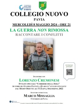 Torna al Collegio Nuovo mercoledì 8 maggio 2024 (ore 21), il giornalista del “Corriere della Sera” Lorenzo Cremonesi, stavolta con un volume in cui ha raccolto le sue esperienze di inviato in zone di conflitti, dall’Iraq di Saddam Hussein alla Libia di Gheddafi, dall’Afghanistan dei Talebani alla Siria di Bashar al-Assad, dalle tormentate terre di Israele e Palestina sino all’Ucraina, non solo quella di questi giorni.