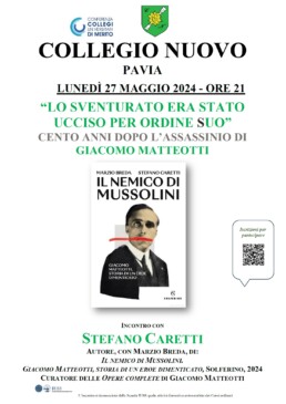 Lunedì 27 maggio 2024 (ore 21) il Collegio Nuovo offre grazie al Professor Stefano Caretti, curatore delle Opere complete di Giacomo Matteotti, una occasione per far conoscere – o rinnovarne la memoria – la figura del parlamentare socialista Giacomo Matteotti: la sua formazione e la sua intensa attività politica, anche in ambito europeo tra Oxford, Parigi, Berlino e Vienna, sino alla sua influenza che si incarna in una “idea che non muore”.
