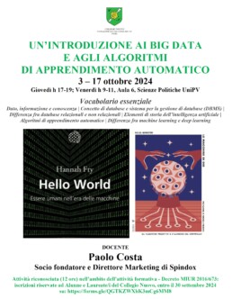 Si parte il 3 ottobre con l’insegnamento “Big data e algoritmi di apprendimento automatico: conoscenza, informazione, potere”, sempre con Paolo Costa, socio fondatore e direttore marketing di Spindox .