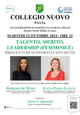 Sono l’avvocata Barbara de Muro, Equity Partner di LCA Studio Legale e da oltre vent’anni Consigliera della Fondazione Sandra e Enea Mattei che inquadra il Collegio Nuovo, e Elena Paola Lanati, fondatrice e CEO di start up innovative nel campo delle life sciences, già Presidente dell’Associazione Alumnae del Nuovo, di cui sono entrambe convinte sostenitrici.