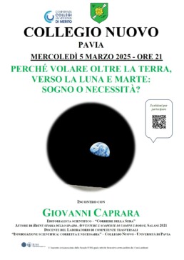 L’incontro con Giovanni Caprara, che ragionerà sui motivi non “dimostrativi” per tornare sulla Luna e andare su Marte, si colloca a due giorni dall’inaugurazione della prima edizione del Laboratorio di competenze trasversali “Informazione scientifica: corretta e necessaria” da lui tenuto e promosso dal Collegio Nuovo nell’ambito del progetto con “Università nei Collegi” lanciato dall’Ateneo pavese.
