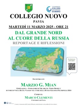 Martedì 11 marzo 2025 (ore 21), al Collegio Nuovo, andiamo nel cuore della Russia, passando anche dal Grande Nord, con Marzio G. Mian, giornalista affiliato al Pulitzer Center di Washington che ha svolto inchieste in 58 Paesi, aggiudicandosi nel 2023 il True Story Award a Berna per il miglior reportage internazionale.