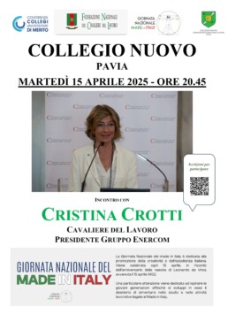 Martedì 15 aprile 2025 (ore 20.45), al Collegio Nuovo si celebra la Giornata del Made in Italy in una iniziativa congiunta con la Conferenza dei Collegi Universitari di Merito e la Federazione Nazionale Cavalieri del Lavoro.