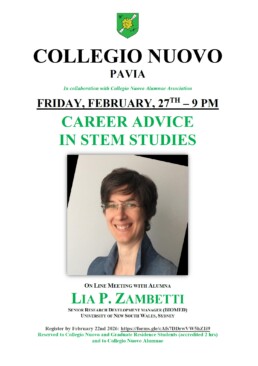 Lia è Senior Research Development Manager (Biomed) presso la University of New South Wales. L’incontro, tenuto in inglese, è riservato alla comunità collegiale del Nuovo e alle Alumnae: si parlerà delle professioni in ambito STEM, dalla ricerca alla dissemination, con un focus anche sulla preparazione di candidature per grants.