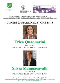 Storie di donne medico, dai primi passi della scelta sino agli sviluppi di carriera più recenti, sono al centro degli incontri con l’Associazione Italiana Donne Medico – Sezione Pavia, presieduta da Nadia Cerutti. Il primo appuntamento riservato alla comunità collegiale del Nuovo si terrà il 23 marzo ore 18.15 con Erica Quaquarini, oncologa, e Silvia Mangiacavalli, ematologa (IRCCS Policlinico San Matteo, Pavia).