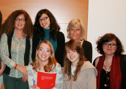 “…la scuola finisce e dove andiamo a finire io e te, e questa maturità” (Nuovità, n. 14)… Da Verona, Emmanuela non prende il treno per la vicina Università di Padova, sua scelta iniziale, ma, dopo aver visitato il Collegio Nuovo a Pavia, decide, nel 2002, di partecipare ai concorsi per i Collegi. Fresca della vincita del Campiello Giovani con il suo “Sconcerto in quattro tempi”, Emmanuela si iscrive a Lettere Moderne. Con un po’ di felice sconcerto, così racconta i suoi primi tempi: “Il mio ingresso in collegio è stato all’insegna delle perplessità e dei timori a partire dalle questioni più pratiche. Ho sempre avuto una dote particolare nel dimenticare nomi cognomi date e ricorrenze. Il primo problema era quindi imparare nel minor tempo possibile un grande numero di nomi da associare metodicamente alle persone che nel giro di pochi giorni avevo conosciuto. Mi sembrava che l’impresa fosse impossibile ma con l’andare del tempo non solo ricordavo i nomi, piano piano imparavo anche a conoscere, e così il secondo problema, la convivenza in un ambiente così affollato, si risolse da sé. Il terzo problema, il più grande, era quello di mettersi in gioco. Il mio modo di essere, che seguiva il “vivi nascosto”, in un luogo del genere non poteva funzionare. Poi, col passare del tempo, il mio modo di vedere il collegio si capovolgeva, la mia stanza da vuota si riempiva di cose, si stringevano i legami con molte persone, iniziavo a sentirmi a mio agio e a intravedere un percorso” (Nuovità n. 18, già pubblicato su “L’Osservatore romano”, 2007). Un percorso che la porterà, lei alla destra nella foto, a condividere in qualche modo un “destino” simile a quello di Melania G. Mazzucco, ospite in Collegio nel 2014, ritratta sul lato opposto.