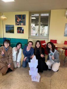 L’attività è proseguita con la suddivisione in due squadre miste e con la costruzione di castelli di fogli di carta. Una sola regola: usare fogli di carta e forbici per costruire un castello che fosse più alto di quello dell’altra squadra. Ahimè, la mia squadra è risultata perdente, ma questo non ci ha impedito di farci una foto tutte insieme di fronte alla nostra costruzione!